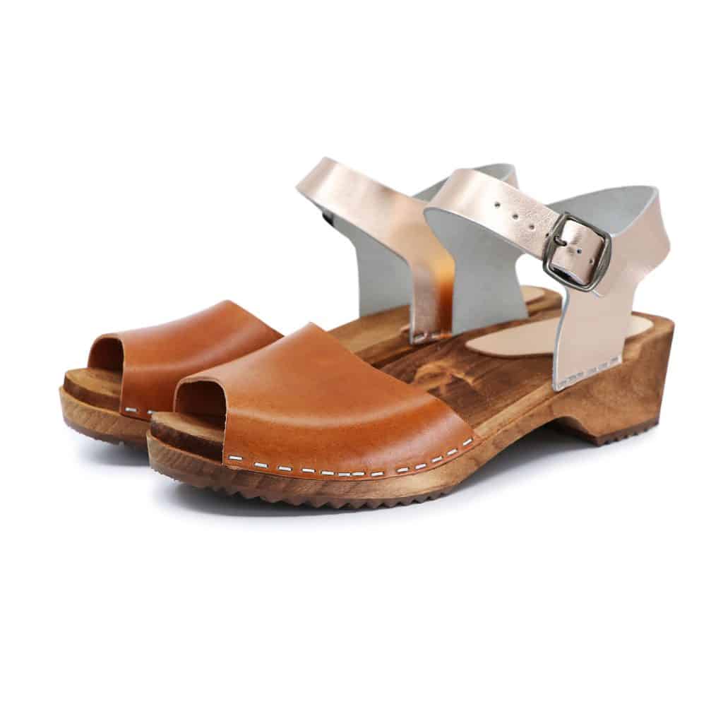 CLEO Holz Clogs Sandale mit Absatz natur gold – für SCHLANKE Füße