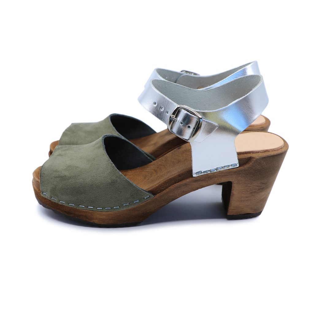 CLEO Holz Clogs Sandale mit Absatz und dunkle Sohle salbei silber