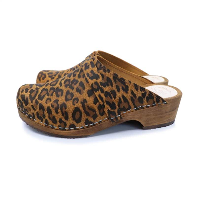 LYCKA Holzclogs flach COW braun-weiss – KUHFELL mit dunkler Sohle