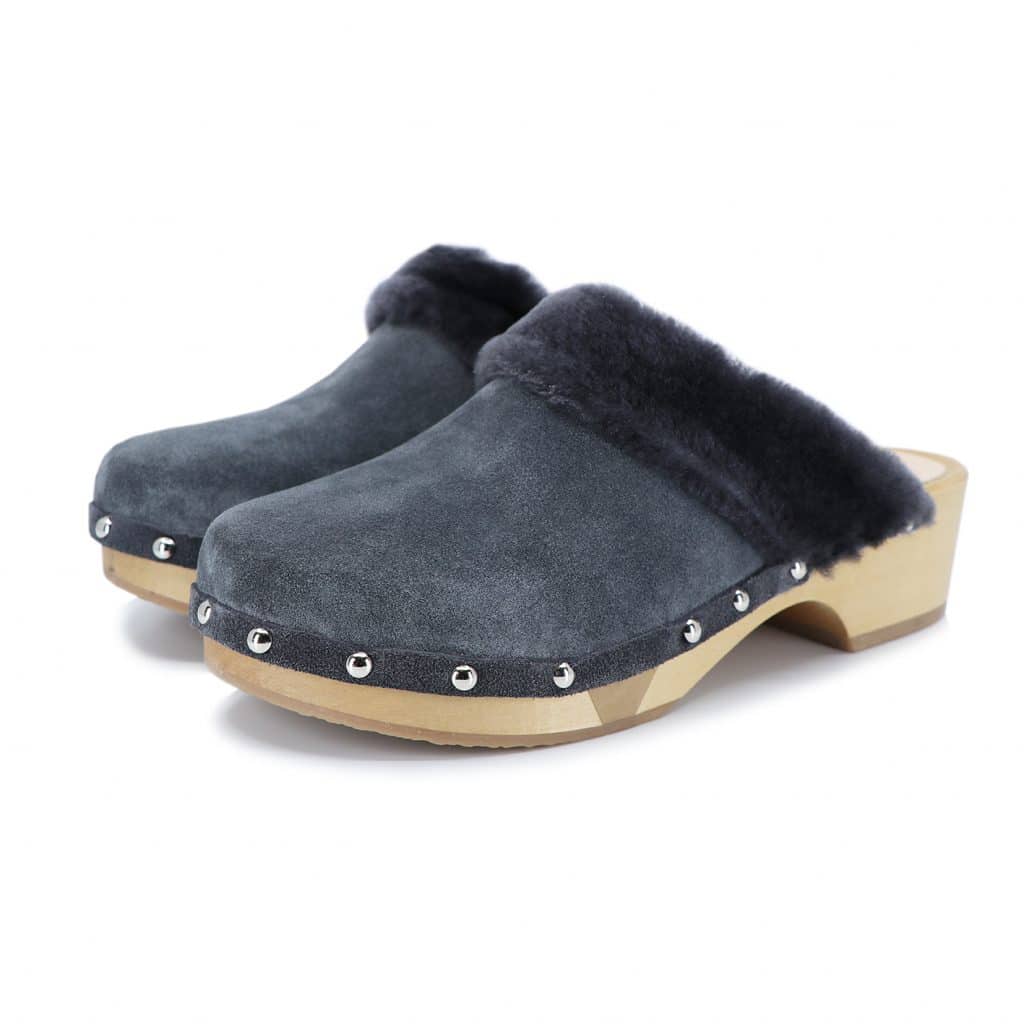 CLARA Holz Clogs mit flexibler Sohle flach und Fell grau