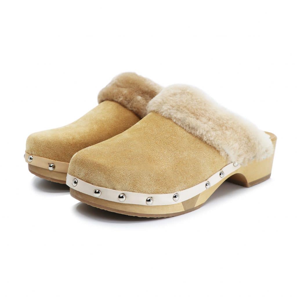 CLARA Holz Clogs mit flexibler Sohle flach und Fell beige