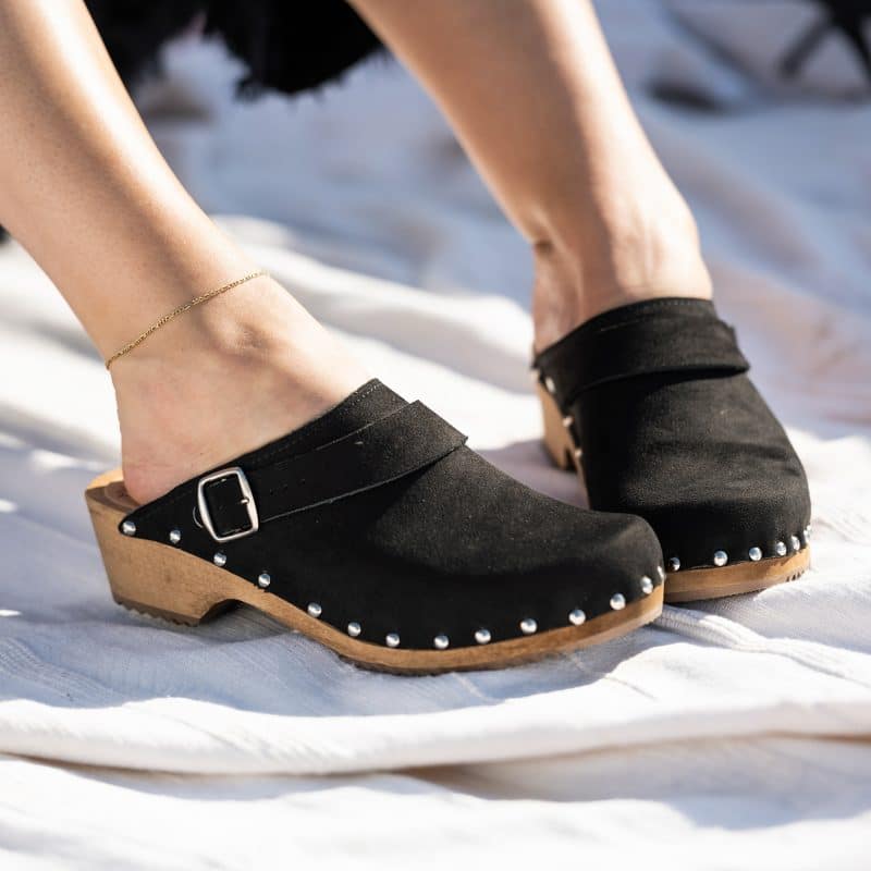 LYCKA Holz Clogs flach mit Nieten schwarz suede
